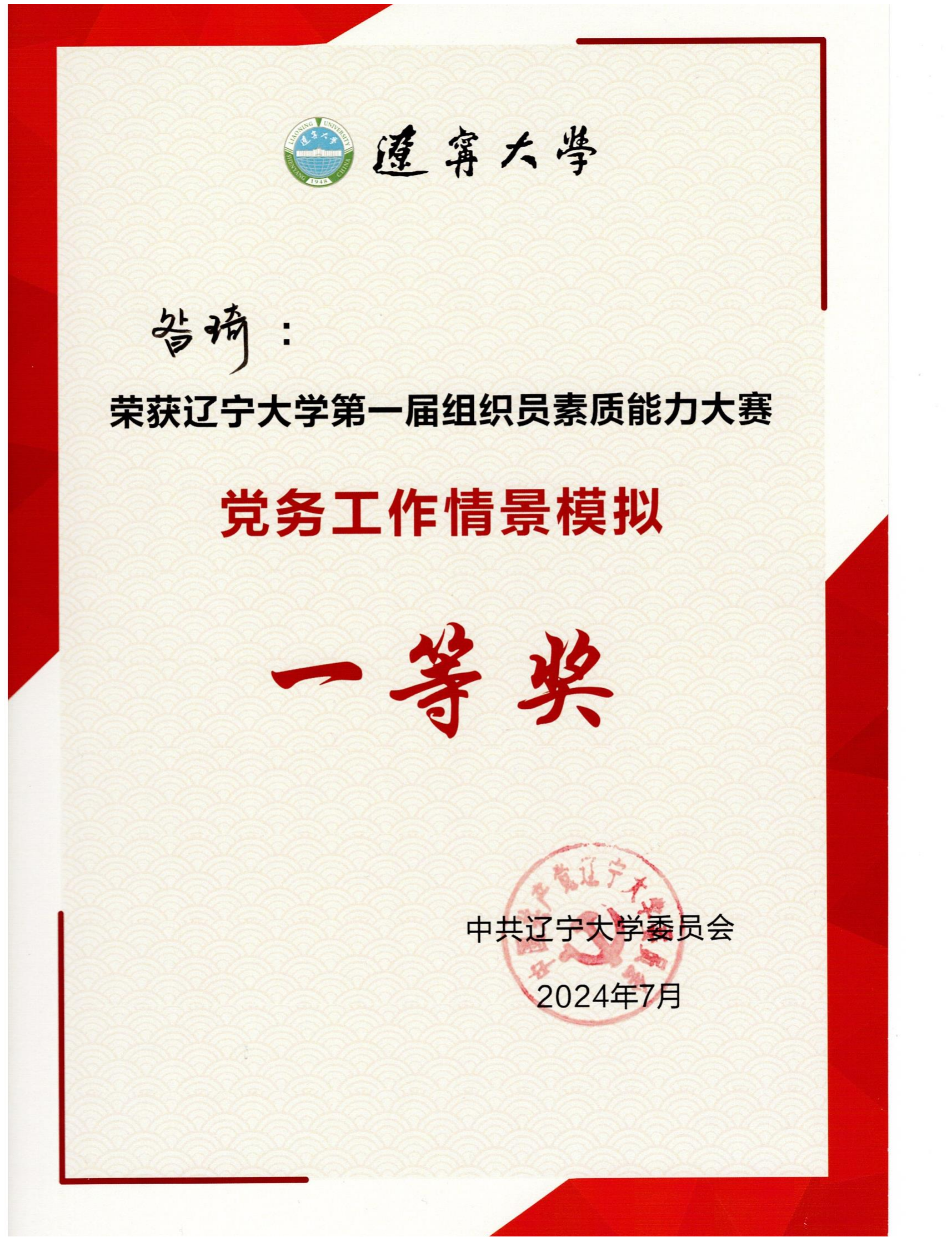近日,商学院党委专职组织员昝琦在辽宁大学第一届组织员素质能力大赛中荣获素质能力大赛总成绩二等奖,获得工作方案策划单项赛二等奖,工作情景模拟单项赛一等奖。