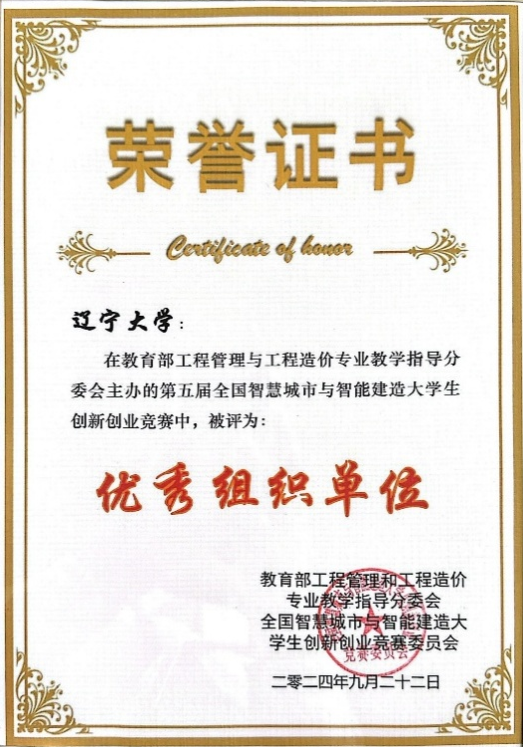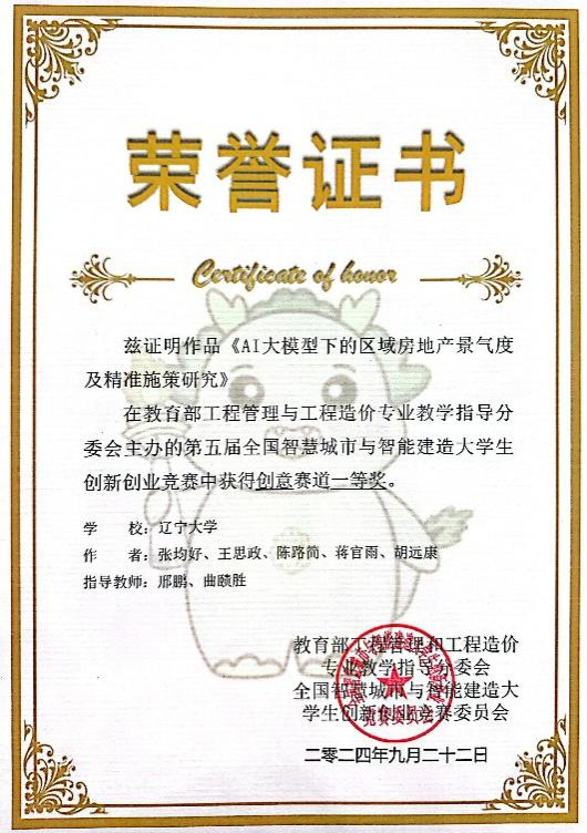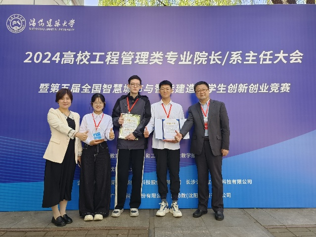 2024年9月21日至22日,由教育部工程管理和工程造价专业教学指导分委员会主办的第五届全国智慧城市与智能建造大学生创新创业竞赛在沈阳建筑大学举行。商学院邢鹏老师和系主任曲赜胜老师共同指导的,由工程管理专业(张均好、王思政、陈路简)及管理科学与工程专业(胡远康、蒋官雨)五位同学组成的代表队,以真实问题为导向,撰写的《AI大模型下的区域房地产景气度及精准施策研究》作品,经过多轮的专家网上函评和线下答辩,从全国38所高校近50支精英队伍中脱颖而出,继2019年斩获首届比赛全国一等奖后,辽宁大学代表队再次勇夺全国一等奖。同时辽宁大学还被授予“优秀组织单位”奖。