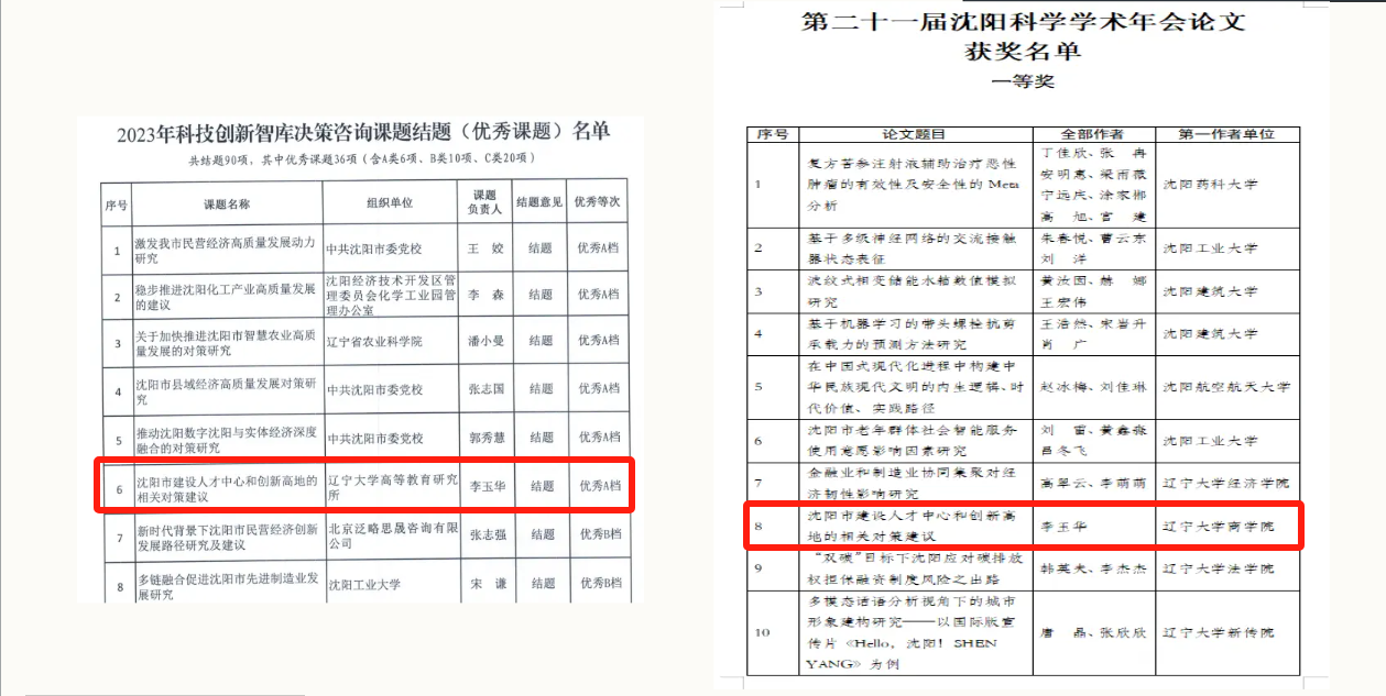 该论文是2023年度沈阳市科技创新智库决策咨询课题结题成果,获评结题优秀课题A类,在90项结题课题中仅评选36项优秀课题,其中A类课题6项。同时,该论文在第二十一届沈阳科学学术年会178篇参选论文中获评优秀论文一等奖。
