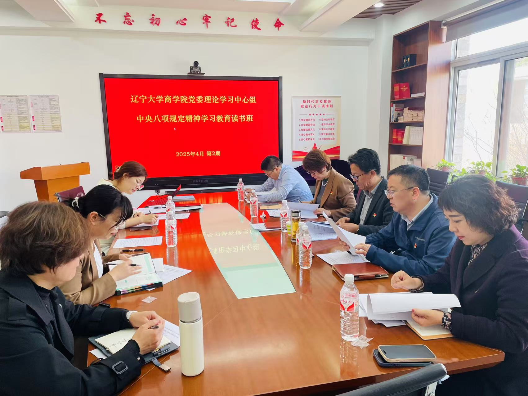 李玉华领学研读《辽宁大学贯彻执行中央八项规定精神实施细则》,院长韩亮亮、学院党委副书记兼副院长兼纪委书记马晓君结合自身工作实际,围绕学习习近平总书记关于加强党的作风建设的重要论述和中央八项规定及其实施细则精神作重点交流研讨。每位处级党员干部对照问题清单进行自查。马晓君通报六起高等教育领域违反中央八项规定精神典型案例,进行以案说纪警示教育。