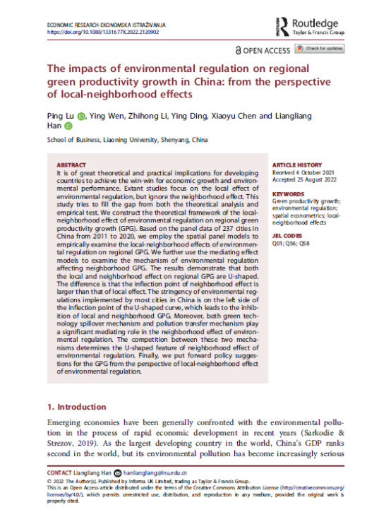 商学院教师鹿坪的学术论文“The impacts of environmental regulation on regional green productivity growth in China: from the perspective of local-neighborhood effects”于2022年9月15日在经济类国际知名期刊《ECONOMIC RESEARCH-EKONOMSKA ISTRAZIVANJA》在线发表。商学院硕士研究生温颖、李志红等参与论文写作。该期刊系SSCI期刊,JCR分区Q2,2021年影响因子3.08。