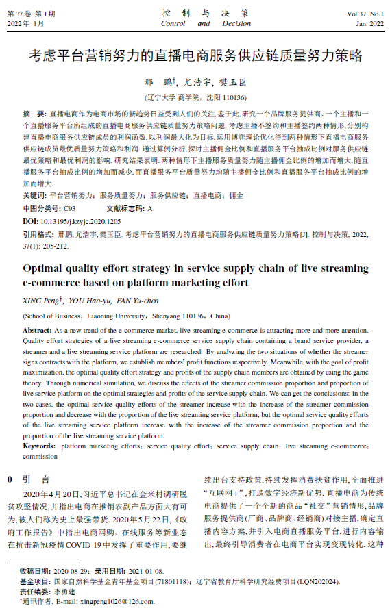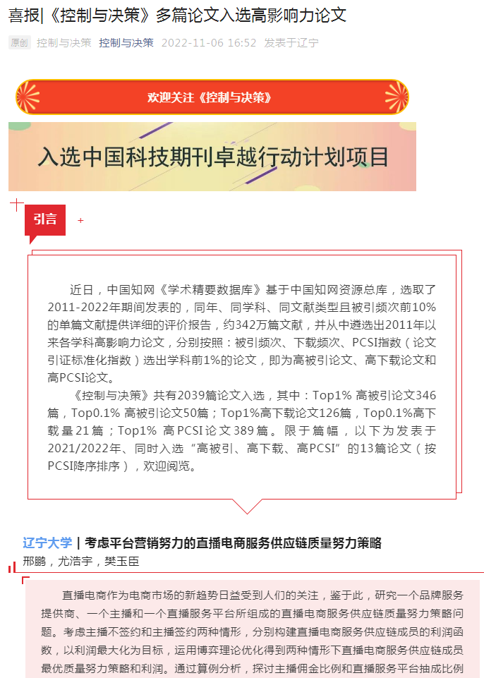 商学院邢鹏副教授(第一作者)与樊玉臣副教授合作发表论文《考虑平台营销努力的直播电商服务供应链质量努力策略》在《控制与决策》上发表。该论文入选了期刊2022年第1期三篇封面论文之一。同时基于中国知网资源总库《学术精要数据库》,该论文还入选2011-2022年“高被引、高下载、高PCSI”论文(期刊共13篇论文入选,本论文排名第1)。